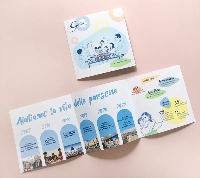 Abbiamo sviluppato un concept grafico basato su illustrazioni semplici e umane, capaci di trasmettere empatia e partecipazione. La palette cromatica istituzionale è stata integrata con accenti pastello per raccontare la delicatezza e la speranza che la Fondazione semina ogni giorno.