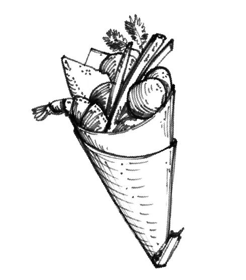 Il racconto passa anche attraverso disegni a mano che raffigurano ingredienti, piatti tipici e dettagli della tradizione culinaria locale.